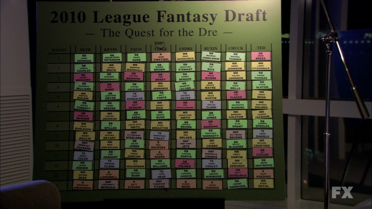 The show gets a couple of cameos from NFL players. Antonio Gates, Chad Ochocinco and Josh Cribbs all make appearances. All the devotion to fantasy football though leaves you wondering exactly why the characters are so bad at it. Many of the football comments made in the show make absolutely no sense to the average sports fan, and that’s even counting for the lead time between the writing of the show and its airing. The best example of this might in the draft board for the second season, which they didn’t need to show, but show well enough that you can read all the players, and a lot of it makes no sense to anyone who played fantasy football last year. Two of the stranger choices are Ray Rice falling all the way to 11 and Steven Jackson somehow falling to the fourth round.