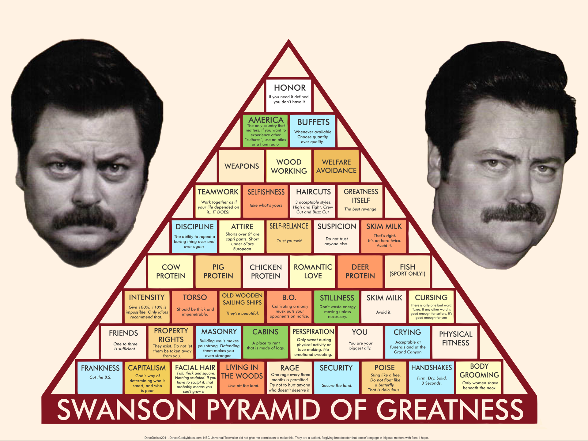 Even better, the supporting cast had come out of its shell. Andy, the deadbeat boyfriend in the first episode originally planned to only appear in a couple of episodes, changed completely into a lovable happy go lucky but delightfully a little bit slow witted character who has become one of the breakout characters of the show. The other biggest breakout character was mustachioed boss Ron Swanson, played by Nick Offerman, whose anti-government libertarian positions meant he left all the work for Leslie, and who offers lines, which even completely out of context sound wonderful like “You had me at meat tornado,” and produces the Ron Swanson Pyramid of Greatness, shown below. The fact tha these characters have broken out so successfully, has obscured who I thought would be the obvious breakout character, Aziz Ansari’s Tom Haverford, whose fantastic renaming of food quote (I cut some of it, but it’s so good I didn’t want to leave out too much)”Fried chicken is fry fry chicky chick. Chicken Parm is chickey chickey parm parm. Chicken Cacciatore chickey catch. I call eggs pre-birds or future birds. Root beer is super water. Tortillas are bean blankies. And I call forks food rakes.” inspired a fantastic website, Tom Haverfoods.